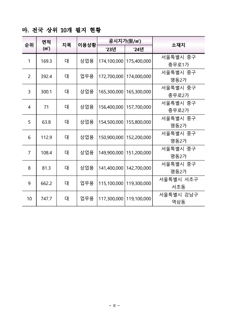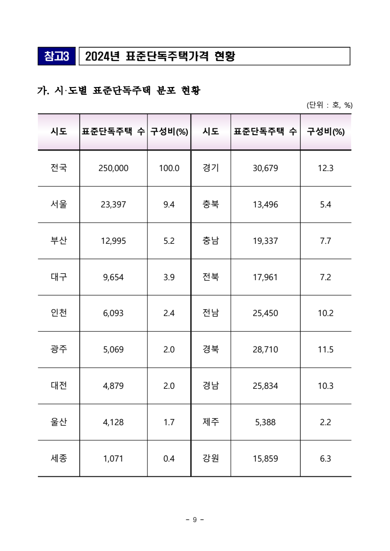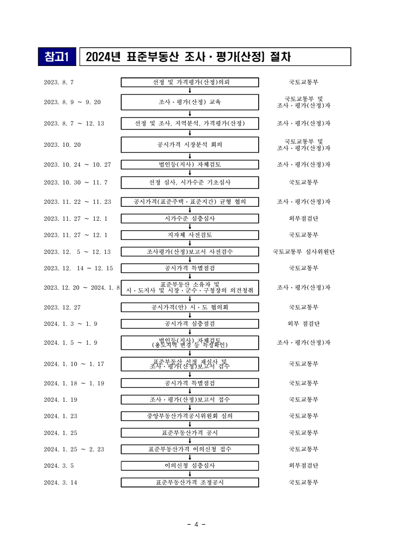 - 1 - ‘24년 표준지·표준주택 공시가격(안) 열람- ’24년 공시가격(안) 변동률 : 표준지 1.1%, 표준주택 0.57% 상승□ 국토교통부(장관 원희룡)는 ’24년 1월 1일 기준으로 조사ㆍ산정한 표준지(58만 필지), 표준주택(25만호)의 공시가격(안)에 대한 소유자 열람 및 의견청취 절차를 ’23년 12월 20일(수)부터 ’24년 1월 8일(월)까지 진행한다. ※ 표준지ㆍ표준주택 공시가격은 개별공시지가와 개별주택가격 산정의 기준으로, 개별공시지가와 개별주택가격은 표준지ㆍ표준주택 공시가격을 토대로 시‧군‧구에서 산정ㅇ ’24년 공시가격(안)은 지난 11월 21일 발표한 「부동산 공시가격 현실화 계획 재수립방안」에 따라 금년과 동일하게 현실화 계획 수립 이전인 ’20년 수준의 현실화율*이 적용되어 산정되었고, 부동산 시장의 변동성이작아’23년 대비 표준지 1.1%, 표준주택 0.57%의 적은 공시가격 변동을 보였다. * ‘24년 적용한 현실화율(=’20년 수준)은 표준지 65.5%, 표준주택 53.6% □ ’24년 표준지 공시지가(안)의 주요 내용은 다음과 같다. ㅇ ’24년 표준지는 공시지가의 정확성 제고를 위해 ’23년 대비 약 2만 필지가 증가한 58만 필지*(전국 공시대상 토지 3,535만 필지)를 선정하였다. * 117개 감정평가법인 및 감정평가사무소(1,270명의 감정평가사)가 조사ㆍ평가에 참여ㅇ 감정평가사의 시세조사를 토대로 산정한 ’24년 전국 표준지 공시지가(안)은 ’23년 대비 1.1% 상승한 것으로 조사되었으며, 이는 지난 10년간가장 작은 변동률(절대값 기준)이다. 【 최근 10년간 전국 표준지 공시지가 변동률 현황 (단위 : %) 】 연도 ‘15 ‘16 ‘17 ‘18 ‘19 ‘20 ‘21 ‘22 ‘23 ‘24(안) 변동률 4.14 4.47 4.94 6.02 9.42 6.33 10.35 10.17 -5.91 1.10 보도시점 : 2023. 12. 20.(수) 06:00 이후(12. 20.(수) 석간) / 배포 : 2023. 12. 19.(화) 보도자료 - 2 - ㅇ 또한, 전국의 모든 지역*과 모든 토지 이용상황**에 있어서도 표준지 공시지가(안) 변동이 미미한 것으로 나타났다. * (상위 5곳) 세종 1.59%↑, 경기 1.35%↑, 대전 1.24%↑, 서울 1.21%↑, 광주 1.16%↑(하위 5곳) 제주 0.45%↓, 전북 0.21%↑, 울산 0.21%↑, 전남 0.36%↑, 부산 0.53%↑ ** (상업) 1.32%↑, (공업) 1.16%↑, (주거) 1.01%↑, (농경지) 1.01%↑, (임야) 0.62%↑□ ’24년 표준주택 공시가격(안)의 주요 내용은 다음과 같다. ㅇ ’24년 표준주택은 25만호(전국 공시대상 단독주택 409만호)를 선정하였으며, 주택 멸실, 용도변경, 개발사업 시행 등의 사유로 표준주택의 대표성을 확보하기 위해 ’23년 표준주택 중 6천호를 교체하였다. ㅇ 한국부동산원의 시세조사를 토대로 산정한 ’24년 전국 표준주택 공시가격(안)은 ’23년 대비 0.57% 상승하였으며, 이는 주택공시 도입(‘05년) 이래 가장 작은 변동률(절대값 기준)이다. 【 최근 10년간 전국 표준주택 공시지가 변동률 현황 (단위 : %) 】 연도 ‘15 ‘16 ‘17 ‘18 ‘19 ‘20 ‘21 ‘22 ‘23 ‘24(안) 변동률 3.81 4.15 4.75 5.51 9.13 4.47 6.80 7.34 -5.95 0.57 ㅇ 또한, 시ㆍ도별로는 ’24년 현실화율 동결 효과로 전 지역에서 공시가격(안) 변동이 최소화*되었으며, 공시가격(안)이 하락한 지역도 일부 나타났다. * (상위 5곳) 서울 1.17%↑, 경기 1.05%↑, 세종 0.91%↑, 광주 0.79%↑, 인천 0.58%↑(하위 5곳) 제주 0.74%↓, 경남 0.66%↓, 울산 0.63%↓, 대구 0.49%↓, 부산 0.47%↓□ ’24년 표준지 공시지가(안)과 표준주택 공시가격(안)은 「부동산 공시가격알리미」(www.realtyprice.kr)와 해당 표준지 및 표준주택이 소재한 시‧군‧ 구청 민원실에서 ’23년 12월 20일(수)부터 열람할 수 있으며, - 3 - ㅇ 의견이 있는 경우에는 ’24년 1월 8일(월)까지 의견서를 「부동산공시가격알리미」 사이트에서 온라인으로 제출하거나, 해당 표준지 담당 감정평가사(표준지) 또는 한국부동산원 각 지사(표준주택), 시‧군‧구 민원실(표준지・표준주택)에 서면으로 제출할 수 있다. * 의견서 양식은 부동산공시가격알리미 사이트에서 내려 받거나 시‧군‧구청 민원실에비치된 서식 이용 (부동산 공시가격 전화 상담실 : ☎ 1644-2828) □ 소유자 및 지자체의 의견청취 절차가 마무리된 ’24년 표준지 공시지가(안)과 표준주택 공시가격(안)은 중앙부동산가격공시위원회 심의를 거쳐’24년 1월 25일(목) 공시할 예정이다. 담당 부서 토지정책관 부동산평가과 책임자 과 장 이유리 (044-201-3422) 담당자 사무관 김부병 (044-201-3423) 사무관 최승필 (044-201-3426) - 4 - 참고1 2024년 표준부동산 조사ᆞ평가(산정) 절차 2023. 8. 7 선정 및 가격평가(산정)의뢰 국토교통부 ↓ 2023. 8. 9 ∼ 9. 20 조사ㆍ평가(산정) 교육 국토교통부 및 조사ㆍ평가(산정)자 ↓ 2023. 8. 7 ∼ 12. 13 선정 및 조사, 지역분석, 가격평가(산정) 조사ㆍ평가(산정)자 ↓ 2023. 10. 20 공시가격 시장분석 회의 국토교통부 및 조사ㆍ평가(산정)자 ↓ 2023. 10. 24 ∼ 10. 27 법인등(지사) 자체검토 조사ㆍ평가(산정)자 ↓ 2023. 10. 30 ∼ 11. 7 선정 심사, 시가수준 기초심사 국토교통부 2023. 11. 22 ∼ 11. 23 공시가격(표준주택ㆍ표준지간) 균형 협의 조사ㆍ평가(산정)자 ↓ 2023. 11. 27 ∼ 12. 1 시가수준 심층심사 외부점검단 ↓ 2023. 11. 27 ∼ 12. 1 지자체 사전검토 국토교통부 ↓ 2023. 12. 5 ∼ 12. 13 조사평가(산정)보고서 사전검수 국토교통부 심사위원단 ↓ 2023. 