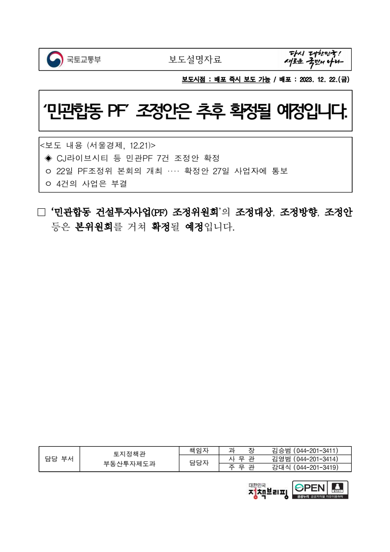 보도설명자료 보도시점 : 배포 즉시 보도 가능 / 배포 : 2023. 12. 22.(금) ‘민관합동 PF’ 조정안은 추후 확정될 예정입니다. <보도 내용 (서울경제, 12.21)> ◈ CJ라이브시티 등 민관PF 7건 조정안 확정 ㅇ 22일 PF조정위 본회의 개최 ···· 확정안 27일 사업자에 통보 ㅇ 4건의 사업은 부결 □ ‘민관합동 건설투자사업(PF) 조정위원회’의 조정대상, 조정방향, 조정안등은 본위원회를 거쳐 확정될 예정입니다. 담당 부서 토지정책관 부동산투자제도과 책임자 과 장 김승범 (044-201-3411) 담당자 사 무 관 김영범 (044-201-3414) 주 무 관 강대식 (044-201-3419)