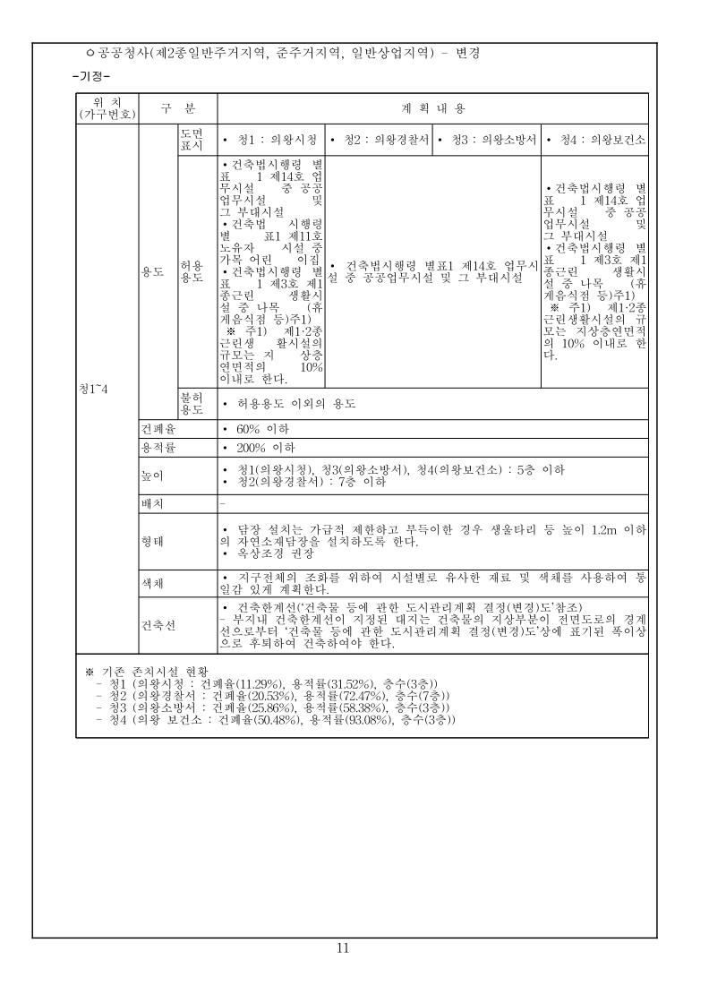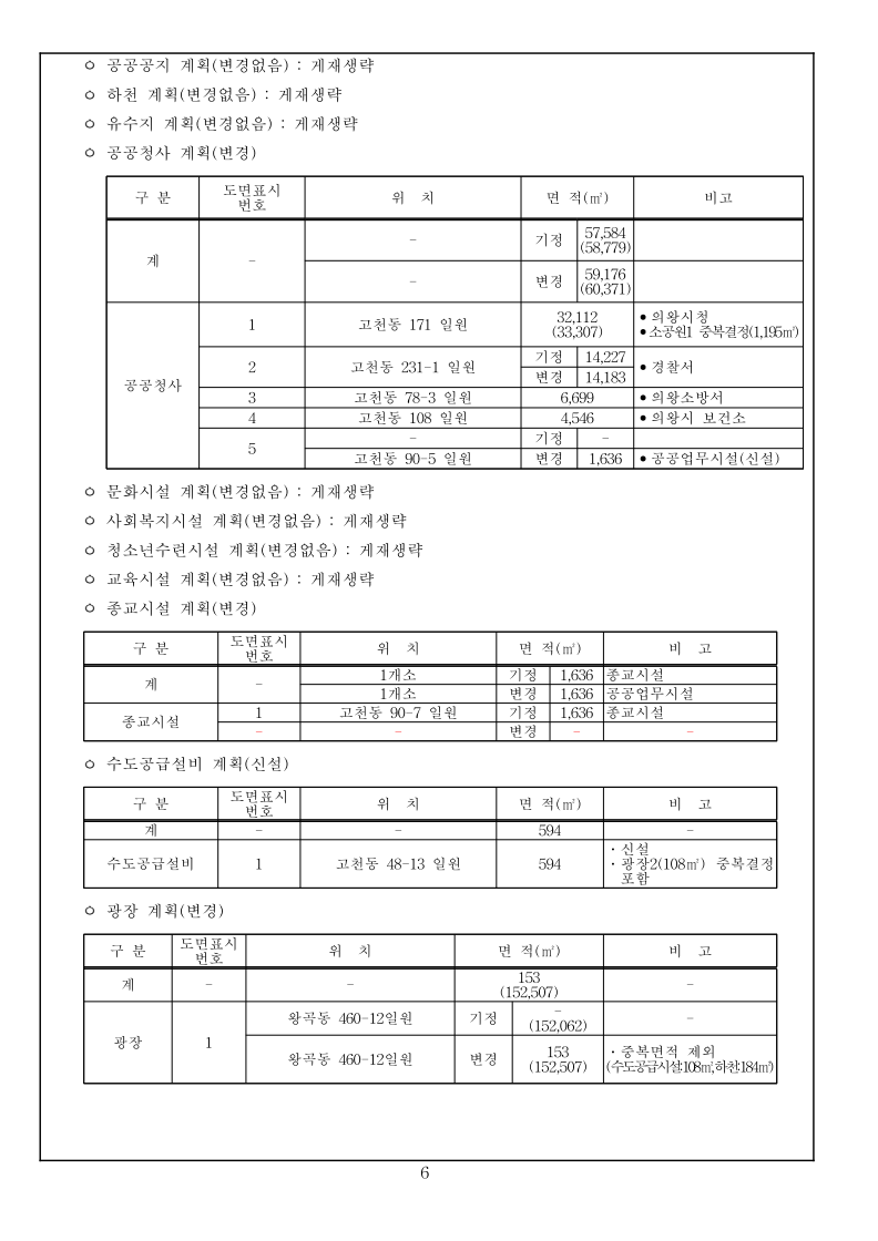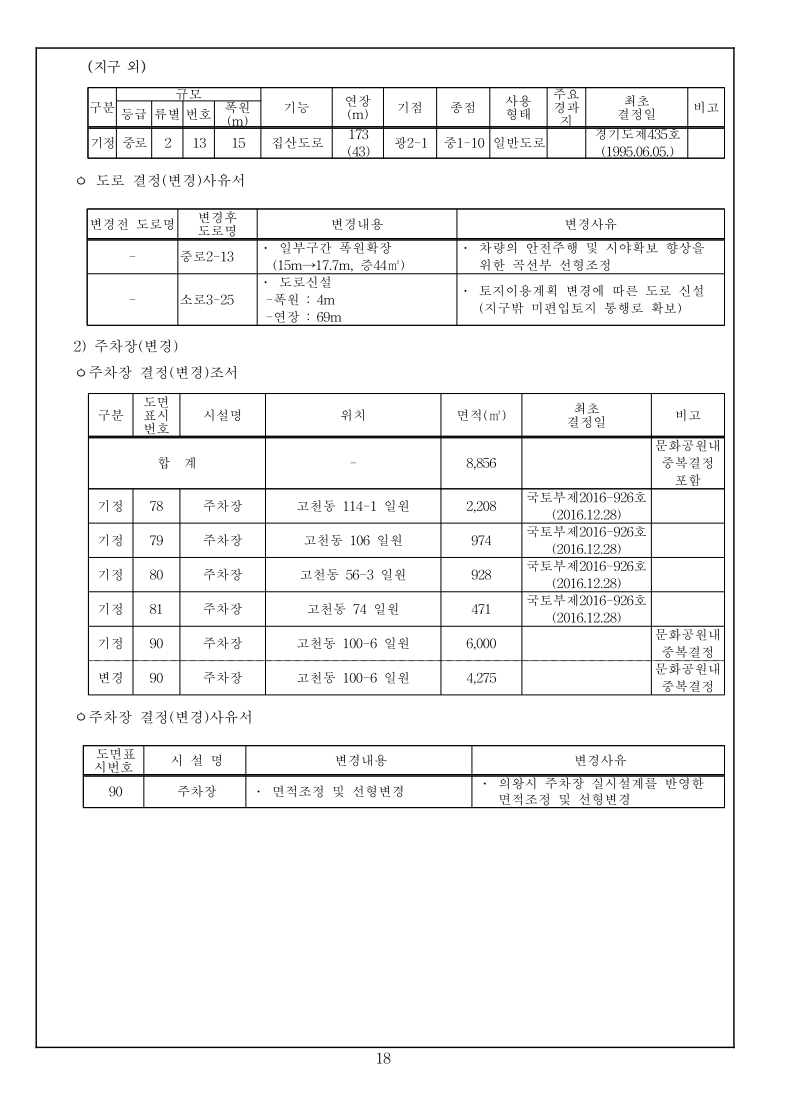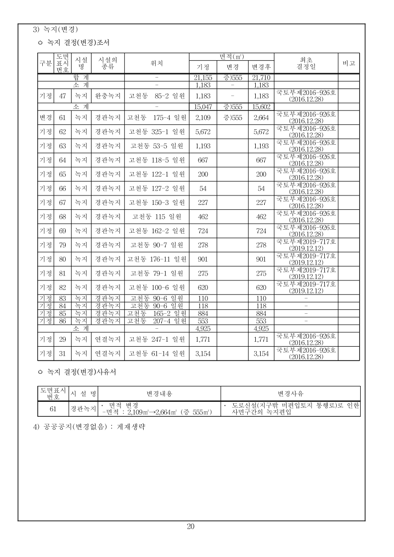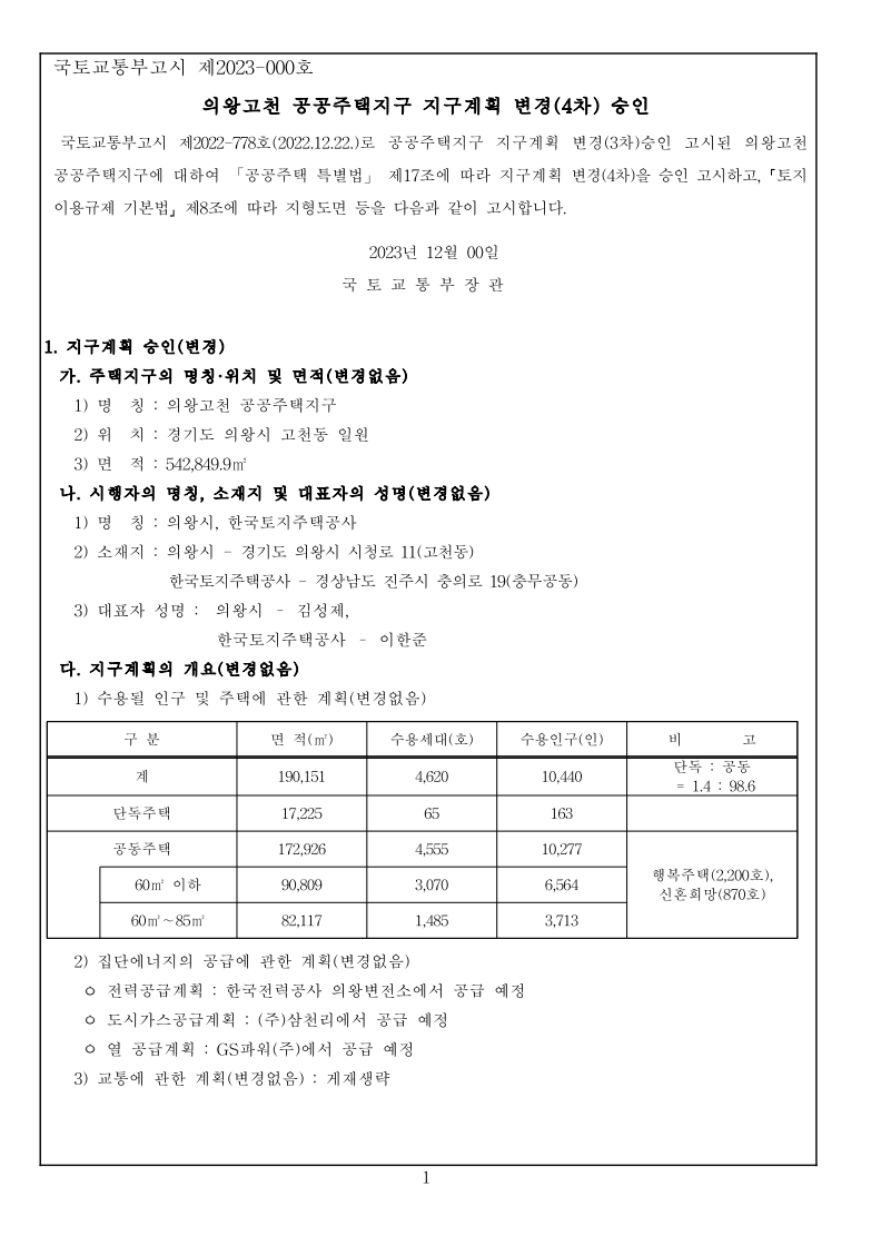 1 국토교통부고시 제2023-000호 의왕고천 공공주택지구 지구계획 변경(4차) 승인 국토교통부고시 제2022-778호(2022.12.22.)로 공공주택지구 지구계획 변경(3차)승인 고시된 의왕고천공공주택지구에 대하여 「공공주택 특별법」 제17조에 따라 지구계획 변경(4차)을 승인 고시하고, 「토지이용규제 기본법」 제8조에 따라 지형도면 등을 다음과 같이 고시합니다. 2023년 12월 00일 국 토 교 통 부 장 관 1. 지구계획 승인(변경) 가. 주택지구의 명칭·위치 및 면적(변경없음) 1) 명 칭 : 의왕고천 공공주택지구 2) 위 치 : 경기도 의왕시 고천동 일원 3) 면 적 : 542,849.9㎡ 나. 시행자의 명칭, 소재지 및 대표자의 성명(변경없음) 1) 명 칭 : 의왕시, 한국토지주택공사 2) 소재지 : 의왕시 - 경기도 의왕시 시청로 11(고천동) 한국토지주택공사 - 경상남도 진주시 충의로 19(충무공동) 3) 대표자 성명 : 의왕시 – 김성제, 한국토지주택공사 – 이한준 다. 지구계획의 개요(변경없음) 1) 수용될 인구 및 주택에 관한 계획(변경없음) 구 분 면 적(㎡) 수용세대(호) 수용인구(인) 비 고 계 190,151 4,620 10,440 단독 : 공동 = 1.4 : 98.6 단독주택 17,225 65 163 공동주택 172,926 4,555 10,277 행복주택(2,200호), 신혼희망(870호) 60㎡ 이하 90,809 3,070 6,564 60㎡∼85㎡ 82,117 1,485 3,713 2) 집단에너지의 공급에 관한 계획(변경없음) ㅇ 전력공급계획 : 한국전력공사 의왕변전소에서 공급 예정 ㅇ 도시가스공급계획 : (주)삼천리에서 공급 예정 ㅇ 열 공급계획 : GS파워(주)에서 공급 예정 3) 교통에 관한 계획(변경없음) : 게재생략 2 4) 대상토지의 단계별 조성에 관한 계획(변경없음) (단위 : 천㎡) 구 분 계 연 도 별 비고2016년 2017년 2018년 2019년 2020년 2021년 2022년 2023년 2024년 용지보상 기정 543 2 301 139 68 11 11 11 - - 변경 543 2 301 139 68 11 11 5 4 2 조성공사 기정 543 2 301 139 68 11 11 11 - - 변경 543 2 301 139 68 11 11 5 4 2 5) 연차별 자금투자 및 재원조달에 관한 계획(변경없음) ㅇ 연차별 자금투자계획 (단위 : 억원) 구 분 계 연 차 별 계 획 비고2016년 2017년 2018년 2019년 2020년 2021년 2022년 2023년 2024년 사 업 비 합계 5,728 47 2,702 849 996 440 400 102 100 92 의왕시 125 - 21 104 - - - - - - 한국토지주택공사 5,603 47 2,681 745 996 400 400 102 100 92 ㅇ 재원조달계획(변경없음) : 의왕시, 한국토지주택공사 자체자금 라. 사업시행기간(변경없음) ◦ 2015년 12월 31일(지구지정 고시일) ~ 2024년 06월 30일 3 마. 토지이용에 관한 계획(변경) 1) 총괄(변경) 구 분 면적(㎡) 구성비(%) 기정 변경 기정 변경 증감(㎡) 비 고 합 계 542,849.90 542,849.90 100.0 100.0 - 주택 건설 용지 소 계 195,664 195,664 36 36 - 단독주택 17,225 17,225 3.2 3.2 - 공동주택 172,926 172,926 31.9 31.9 - 근린생활시설 5,513 5,513 1.0 1.0 - 공공 시설 용지 소 계 347,185.90 347,185.90 64.0 64.0 - 도시 지원 시설 용지 소계 111,431 111,387 20.5 20.5 감)44 상업용지 14,772 14,772 2.7 2.7 - 업무시설 4,079 4,079 0.8 0.8 - 공 공 청 사 소 계 57,584 59,176 10.6 10.9 증)1,592 의왕시청 32,112 32,112 5.9 5.9 - ·존치시설 ·소공원1 중복결정 면적(1,195㎡) 제외 경찰서 14,227 14,183 2.6 2.6 감)44 ·존치시설 소방서 6,699 6,699 1.2 1.2 - ·존치시설 보건소 4,546 4,546 0.8 0.8 - ·존치시설 공공업무시설 - 1,636 - 0.3 증)1,636 ·신설 사회복지시설 4,405 4,405 0.8 0.8 - ·존치시설 청소년수련시설 4,388 4,388 0.8 0.8 - ·존치시설 문화시설 10,693 10,693 2.0 2.0 - ·계획 현황시설 종교시설 1,636 - 0.3 - 감)1,636 ·변경(공공업무시설) 자족시설 9,293 9,293 1.7 1.7 - 주차장 4,581 4,581 0.8 0.8 - ·문화공원내 중복결정(4,275㎡) 제외공원 · 녹지 소 계 132,957 131,934 24.5 24.3 감)1,023 공 원 소 계 88,405 86,827 16.3 16 감)1,578 근린공원 52,678 51,931 9.7 9.6 감)747 ·1개소 소공원 8,569 7,738 1.6 1.4 감)831 ·3개소 ·소공원1과 의왕시청(공공청사1) 중복결정 (1,195㎡) 수변공원 11,193 11,193 2.1 2.1 - ·1개소 (유수지1 중복결정(4,375㎡) 포함) 문화공원 15,965 15,965 2.9 2.9 - ·1개소 (주차장5 중복결정(4,275㎡) 포함) 녹 지 소 계 21,155 21,710 3.9 4.0 증)555 완충녹지 1,183 1,183 0.2 0.2 - ·1개소 경관녹지 15,047 15,602 2.8 2.9 증)555 ·17개소 연결녹지 4,925 4,925 0.9 0.9 - ·2개소 공공공지 616 616 0.1 0.1 - ·2개소 유수지 -4,375 -4,375 -0.8 -0.8 - ·1개소, 수변공원내 중복결정하천 22,781 22,781 4.2 4.2 - ·중복면적 제외 수도공급설비 - 594 - 0.1 증)594 ·1개소 ·광장2(108㎡) 중복결정 포함광장 - 153 - 0.0 증)153 ·중복면적 제외 (수도공급시설:108㎡,하천:184㎡) 교육 시설 소 계 13,091 13,091 2.4 2.4 - 초등학교 11,540 11,540 2.1 2.1 - ·1개소 유치원 1,551 1,551 0.3 0.3 - ·1개소 도로 소 계 89,706.90 90,026.90 16.5 16.6 증)320 도로 89,297.90 89,617.90 16.4 16.5 증)320 ·가감속차선, 가각전제 등 포함보행자도로 320 320 0.1 0.1 - 현황도로 89 89 0.0 0.0 - ·월드비전 진입도로 4 2) 주택건설용지에 관한 계획(변경없음) : 게재생략 3) 상업·업무시설용지 계획(변경없음) : 게재생략 4) 자족시설용지 계획(변경없음) : 게재생략 5) 공공시설용지에 관한 계획(변경) ㅇ 도로 계획(변경) - 지구 내 류별 합계 1류 2류 3류 노선 수 연장 (m) 면적 (㎡) 노선 수 연장 (m) 면적 (㎡) 노선 수 연장 (m) 면적 (㎡) 노선 수 연장 (m) 면적(㎡) 합계 기정 34 5,131 89,706.9 11 2,430 38,240 9 1,413 29,622 14 1,288 14,784 변경 35 5,200 90,026.9 11 2,430 38,240 9 1,413 29,666 15 1,357 15,060 일반도