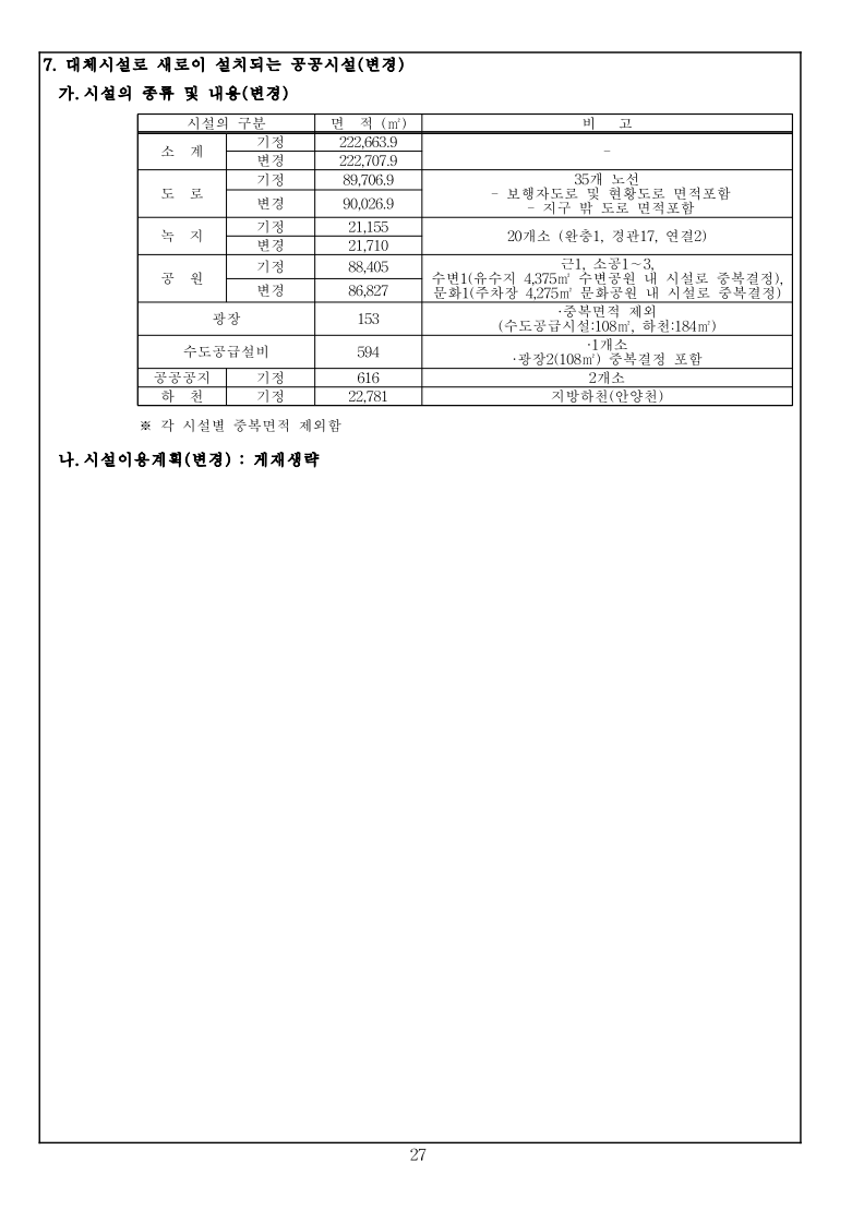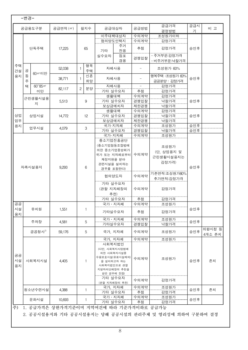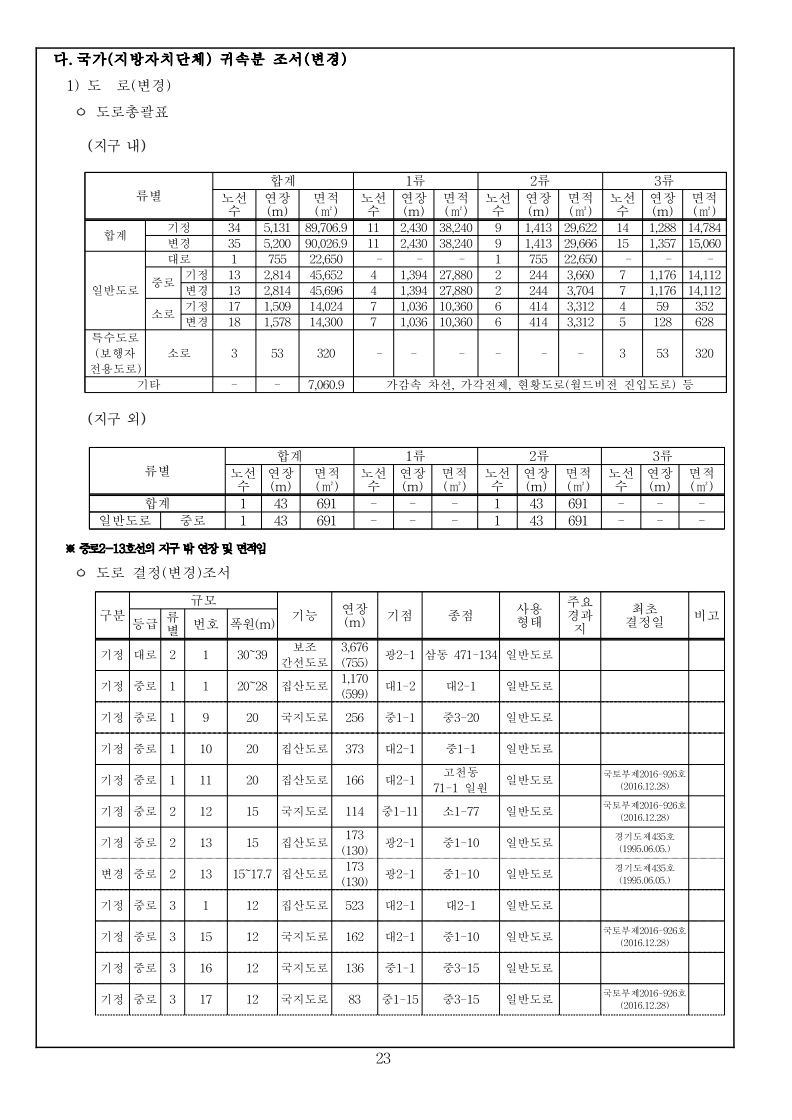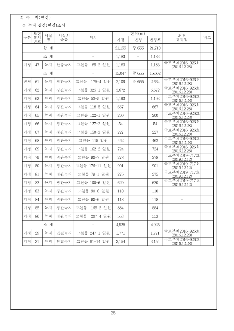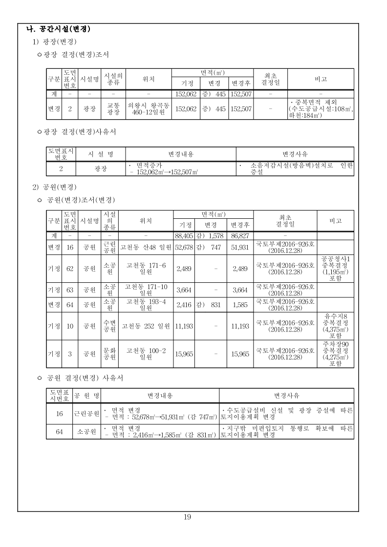 1 국토교통부고시 제2023-000호 의왕고천 공공주택지구 지구계획 변경(4차) 승인 국토교통부고시 제2022-778호(2022.12.22.)로 공공주택지구 지구계획 변경(3차)승인 고시된 의왕고천공공주택지구에 대하여 「공공주택 특별법」 제17조에 따라 지구계획 변경(4차)을 승인 고시하고, 「토지이용규제 기본법」 제8조에 따라 지형도면 등을 다음과 같이 고시합니다. 2023년 12월 00일 국 토 교 통 부 장 관 1. 지구계획 승인(변경) 가. 주택지구의 명칭·위치 및 면적(변경없음) 1) 명 칭 : 의왕고천 공공주택지구 2) 위 치 : 경기도 의왕시 고천동 일원 3) 면 적 : 542,849.9㎡ 나. 시행자의 명칭, 소재지 및 대표자의 성명(변경없음) 1) 명 칭 : 의왕시, 한국토지주택공사 2) 소재지 : 의왕시 - 경기도 의왕시 시청로 11(고천동) 한국토지주택공사 - 경상남도 진주시 충의로 19(충무공동) 3) 대표자 성명 : 의왕시 – 김성제, 한국토지주택공사 – 이한준 다. 지구계획의 개요(변경없음) 1) 수용될 인구 및 주택에 관한 계획(변경없음) 구 분 면 적(㎡) 수용세대(호) 수용인구(인) 비 고 계 190,151 4,620 10,440 단독 : 공동 = 1.4 : 98.6 단독주택 17,225 65 163 공동주택 172,926 4,555 10,277 행복주택(2,200호), 신혼희망(870호) 60㎡ 이하 90,809 3,070 6,564 60㎡∼85㎡ 82,117 1,485 3,713 2) 집단에너지의 공급에 관한 계획(변경없음) ㅇ 전력공급계획 : 한국전력공사 의왕변전소에서 공급 예정 ㅇ 도시가스공급계획 : (주)삼천리에서 공급 예정 ㅇ 열 공급계획 : GS파워(주)에서 공급 예정 3) 교통에 관한 계획(변경없음) : 게재생략 2 4) 대상토지의 단계별 조성에 관한 계획(변경없음) (단위 : 천㎡) 구 분 계 연 도 별 비고2016년 2017년 2018년 2019년 2020년 2021년 2022년 2023년 2024년 용지보상 기정 543 2 301 139 68 11 11 11 - - 변경 543 2 301 139 68 11 11 5 4 2 조성공사 기정 543 2 301 139 68 11 11 11 - - 변경 543 2 301 139 68 11 11 5 4 2 5) 연차별 자금투자 및 재원조달에 관한 계획(변경없음) ㅇ 연차별 자금투자계획 (단위 : 억원) 구 분 계 연 차 별 계 획 비고2016년 2017년 2018년 2019년 2020년 2021년 2022년 2023년 2024년 사 업 비 합계 5,728 47 2,702 849 996 440 400 102 100 92 의왕시 125 - 21 104 - - - - - - 한국토지주택공사 5,603 47 2,681 745 996 400 400 102 100 92 ㅇ 재원조달계획(변경없음) : 의왕시, 한국토지주택공사 자체자금 라. 사업시행기간(변경없음) ◦ 2015년 12월 31일(지구지정 고시일) ~ 2024년 06월 30일 3 마. 토지이용에 관한 계획(변경) 1) 총괄(변경) 구 분 면적(㎡) 구성비(%) 기정 변경 기정 변경 증감(㎡) 비 고 합 계 542,849.90 542,849.90 100.0 100.0 - 주택 건설 용지 소 계 195,664 195,664 36 36 - 단독주택 17,225 17,225 3.2 3.2 - 공동주택 172,926 172,926 31.9 31.9 - 근린생활시설 5,513 5,513 1.0 1.0 - 공공 시설 용지 소 계 347,185.90 347,185.90 64.0 64.0 - 도시 지원 시설 용지 소계 111,431 111,387 20.5 20.5 감)44 상업용지 14,772 14,772 2.7 2.7 - 업무시설 4,079 4,079 0.8 0.8 - 공 공 청 사 소 계 57,584 59,176 10.6 10.9 증)1,592 의왕시청 32,112 32,112 5.9 5.9 - ·존치시설 ·소공원1 중복결정 면적(1,195㎡) 제외 경찰서 14,227 14,183 2.6 2.6 감)44 ·존치시설 소방서 6,699 6,699 1.2 1.2 - ·존치시설 보건소 4,546 4,546 0.8 0.8 - ·존치시설 공공업무시설 - 1,636 - 0.3 증)1,636 ·신설 사회복지시설 4,405 4,405 0.8 0.8 - ·존치시설 청소년수련시설 4,388 4,388 0.8 0.8 - ·존치시설 문화시설 10,693 10,693 2.0 2.0 - ·계획 현황시설 종교시설 1,636 - 0.3 - 감)1,636 ·변경(공공업무시설) 자족시설 9,293 9,293 1.7 1.7 - 주차장 4,581 4,581 0.8 0.8 - ·문화공원내 중복결정(4,275㎡) 제외공원 · 녹지 소 계 132,957 131,934 24.5 24.3 감)1,023 공 원 소 계 88,405 86,827 16.3 16 감)1,578 근린공원 52,678 51,931 9.7 9.6 감)747 ·1개소 소공원 8,569 7,738 1.6 1.4 감)831 ·3개소 ·소공원1과 의왕시청(공공청사1) 중복결정 (1,195㎡) 수변공원 11,193 11,193 2.1 2.1 - ·1개소 (유수지1 중복결정(4,375㎡) 포함) 문화공원 15,965 15,965 2.9 2.9 - ·1개소 (주차장5 중복결정(4,275㎡) 포함) 녹 지 소 계 21,155 21,710 3.9 4.0 증)555 완충녹지 1,183 1,183 0.2 0.2 - ·1개소 경관녹지 15,047 15,602 2.8 2.9 증)555 ·17개소 연결녹지 4,925 4,925 0.9 0.9 - ·2개소 공공공지 616 616 0.1 0.1 - ·2개소 유수지 -4,375 -4,375 -0.8 -0.8 - ·1개소, 수변공원내 중복결정하천 22,781 22,781 4.2 4.2 - ·중복면적 제외 수도공급설비 - 594 - 0.1 증)594 ·1개소 ·광장2(108㎡) 중복결정 포함광장 - 153 - 0.0 증)153 ·중복면적 제외 (수도공급시설:108㎡,하천:184㎡) 교육 시설 소 계 13,091 13,091 2.4 2.4 - 초등학교 11,540 11,540 2.1 2.1 - ·1개소 유치원 1,551 1,551 0.3 0.3 - ·1개소 도로 소 계 89,706.90 90,026.90 16.5 16.6 증)320 도로 89,297.90 89,617.90 16.4 16.5 증)320 ·가감속차선, 가각전제 등 포함보행자도로 320 320 0.1 0.1 - 현황도로 89 89 0.0 0.0 - ·월드비전 진입도로 4 2) 주택건설용지에 관한 계획(변경없음) : 게재생략 3) 상업·업무시설용지 계획(변경없음) : 게재생략 4) 자족시설용지 계획(변경없음) : 게재생략 5) 공공시설용지에 관한 계획(변경) ㅇ 도로 계획(변경) - 지구 내 류별 합계 1류 2류 3류 노선 수 연장 (m) 면적 (㎡) 노선 수 연장 (m) 면적 (㎡) 노선 수 연장 (m) 면적 (㎡) 노선 수 연장 (m) 면적(㎡) 합계 기정 34 5,131 89,706.9 11 2,430 38,240 9 1,413 29,622 14 1,288 14,784 변경 35 5,200 90,026.9 11 2,430 38,240 9 1,413 29,666 15 1,357 15,060 일반도