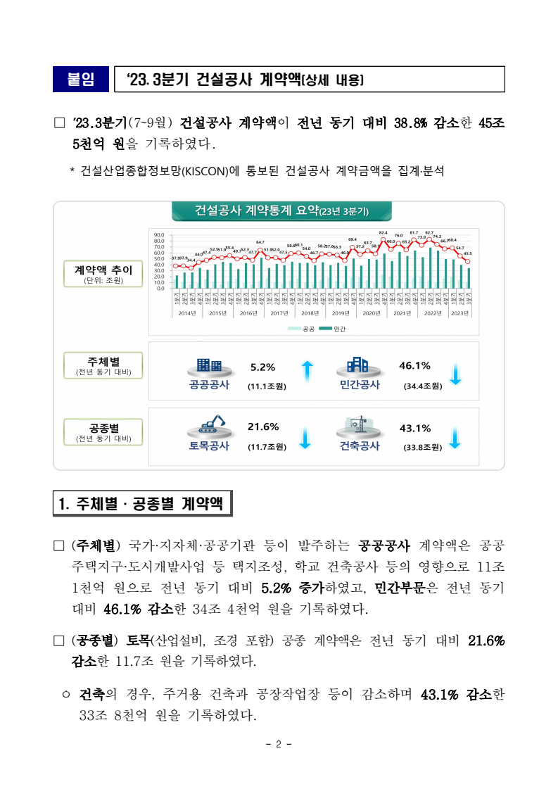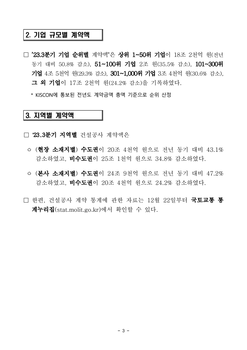 - 1 - 보도시점 : 2023. 12. 24.(일) 11:00 이후(12. 25.(월) 조간) / 배포 : 2023. 12. 22.(금) ‘23년 3분기 건설공사 계약액 발표- 3분기 건설공사 계약액 45.5조 원… 전년 동기대비 38.8%↓ □ 국토교통부는 2023년 3분기 건설공사 계약액이 전년 동기 대비 38.8% 감소한 45.5조 원을 기록하였다고 밝혔다. ㅇ (주체별) 공공부문은 11.1조 원으로 전년 동기 대비 5.2% 증가, 민간부문은 34.4조 원으로 전년 동기 대비 46.1% 감소하였다. ㅇ (공종별) 토목(산업설비, 조경 포함)은 산업설비 등이 감소하며 전년 동기대비 21.6% 감소한 11.7조 원을, 건축은 공장작업장, 주거용 건축 등이감소하며 43.1% 감소한 33.8조 원을 기록하였다. ㅇ (기업규모별) 상위 1~50위 기업은 18.2조 원(전년 동기 대비 50.8% 감), 51~ 100위는 2.0조 원(35.5% 감), 101~300위 4.5조 원(29.3% 감), 301~ 1,000위 3.4조 원(30.6% 감), 그 외 기업이 17.2조 원(24.2% 감)을 기록하였다. ㅇ (현장 소재지별) 수도권이 20.4조 원으로 전년 동기 대비 43.1% 감소하였고, 비수도권이 25.1조 원으로 34.8% 감소하였다. ㅇ (본사 소재지별) 수도권이 24.9조 원으로 전년 동기 대비 47.2% 감소하였고, 비수도권이 20.4조 원으로 24.2% 감소하였다. □ 한편, 건설공사 계약 통계에 관한 자료는 12월 25일(월)부터 국토교통통계누리집(stat.molit.go.kr)에서 확인할 수 있다. 담당 부서 건설정책국 책임자 과 장 이익진 (044-201-3504) 담당자 사무관 김효석 (044-201-4597) 건설정책과 주무관 김소라 (044-201-3506) 보도자료 - 2 - 붙임 ‘23. 3분기 건설공사 계약액(상세 내용) □ ’23.3분기(7~9월) 건설공사 계약액이 전년 동기 대비 38.8% 감소한 45조 5천억 원을 기록하였다. * 건설산업종합정보망(KISCON)에 통보된 건설공사 계약금액을 집계·분석 1. 주체별·공종별 계약액 □ (주체별) 국가·지자체·공공기관 등이 발주하는 공공공사 계약액은 공공주택지구·도시개발사업 등 택지조성, 학교 건축공사 등의 영향으로 11조1천억 원으로 전년 동기 대비 5.2% 증가하였고, 민간부문은 전년 동기 대비 46.1% 감소한 34조 4천억 원을 기록하였다. □ (공종별) 토목(산업설비, 조경 포함) 공종 계약액은 전년 동기 대비 21.6% 감소한 11.7조 원을 기록하였다. ㅇ 건축의 경우, 주거용 건축과 공장작업장 등이 감소하며 43.1% 감소한 33조 8천억 원을 기록하였다. - 3 - 2. 기업 규모별 계약액 □ ’23.3분기 기업 순위별 계약액*은 상위 1~50위 기업이 18조 2천억 원(전년동기 대비 50.8% 감소), 51~100위 기업 2조 원(35.5% 감소), 101~300위 기업 4조 5천억 원(29.3% 감소), 301~1,000위 기업 3조 4천억 원(30.6% 감소), 그 외 기업이 17조 2천억 원(24.2% 감소)을 기록하였다. * KISCON에 통보된 전년도 계약금액 총액 기준으로 순위 산정 3. 지역별 계약액 □ ‘23.3분기 지역별 건설공사 계약액은 ㅇ (현장 소재지별) 수도권이 20조 4천억 원으로 전년 동기 대비 43.1% 감소하였고, 비수도권이 25조 1천억 원으로 34.8% 감소하였다. ㅇ (본사 소재지별) 수도권이 24조 9천억 원으로 전년 동기 대비 47.2% 감소하였고, 비수도권이 20조 4천억 원으로 24.2% 감소하였다. □ 한편, 건설공사 계약 통계에 관한 자료는 12월 22일부터 국토교통 통계누리집(stat.molit.go.kr)에서 확인할 수 있다. - 4 - 건설공사계약통계 이용 시 유의사항 1. 건설공사계약통계는 「건설산업기본법」에 따라 국토교통부에서 운영 중인 건설산업종합정보망(KISCON)에 통보된 건설공사대장 기재사항을 집계·분석한 자료로 종합건설업체와 전문건설업체가 계약한 1억 원 이상 원도급공사가 대상임2. 통계청에서 매월 조사·발표하고 있는 건설 경기 동향조사상의 건설수주와의 증감 변동방향이 서로 다르게 나타날 수 있으며, 이는 조사방법과 조사대상의 차이에 기인함 ① 건설공사계약통계가 종합·전문건설업체의 1억 원 이상 원도급공사 전수를 대상으로 집계하는 반면, 통계청 건설 경기 동향조사는 전전년도 건설업조사 기성액 기준 상위 54%에 해당하는 종합건설업체를 모집단으로 조사를 실시하고 있음 ② 건설공사계약통계는 도급공사를 대상으로 하여 직영공사가 제외된 반면, 통계청 조사는 직영공사를 포함하고 있음 ③ 장기계속공사의 경우 건설공사계약통계는 당해 연도 계약액을 기준으로 하고 있으며, 통계청 조사는 총 공사액을 기준으로 하고 있음 ④ 두 기관 간 세부 조사ㆍ신고기준의 차이가 있을 수 있음 3. 연간 보도자료 공표 일정(공표일정은 변경될 수 있음) 2023년 1분기 건설공사 계약통계 : 2023. 6. 26(월) 2023년 2분기 건설공사 계약통계 : 2023. 9. 22(금) 2023년 3분기 건설공사 계약통계 : 2023. 12. 26(화) 2023년 4분기 건설공사 계약통계 : 2024. 3. 22(금) 4. 통계상 수치는 반올림한 것이므로 세부 항목 간 수치와 전체 합계가 일치하지 않을 수 있으며, 공표되는 성장률(증가율)은 원 단위 금액을 이용하여 계산한 수치로 공표된 조 원 단위의 금액으로 계산한 수치와 차이가 발생할 수 있음 * 일부 공사의 계약변동(신규통보, 계약변경, 계약해지 등) 사항을 반영해 2022년 3분기 지역별 건설공사 계약액에 수정이 있음을 알려드립니다. - 5 - 참고1 발주자별·공종별 건설공사 계약액 《 발주자별·공종별 건설공사 계약액 》 (단위: 조 원, 전년 동기 대비%) 구 분 ’19