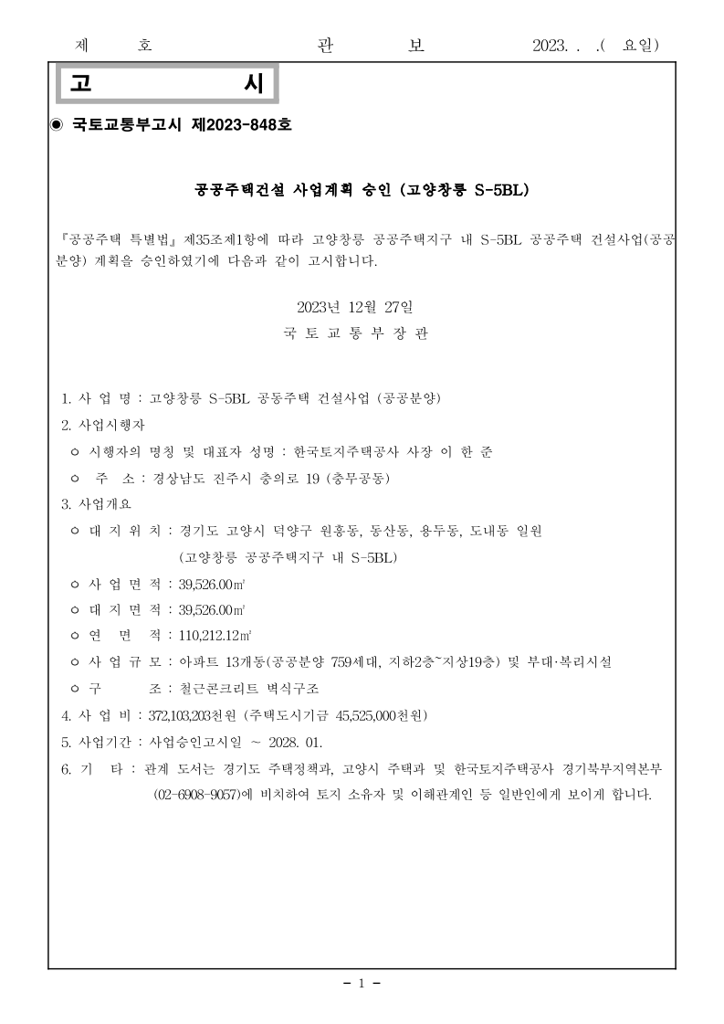 제 호 관 보 2023. . .( 요일) - 1 - 고 시 ◉ 국토교통부고시 제2023-848호 공공주택건설 사업계획 승인 (고양창릉 S-5BL) 『공공주택 특별법』제35조제1항에 따라 고양창릉 공공주택지구 내 S-5BL 공공주택 건설사업(공공분양) 계획을 승인하였기에 다음과 같이 고시합니다. 2023년 12월 27일 국 토 교 통 부 장 관 1. 사 업 명 : 고양창릉 S-5BL 공동주택 건설사업 (공공분양) 2. 사업시행자 ㅇ 시행자의 명칭 및 대표자 성명 : 한국토지주택공사 사장 이 한 준 ㅇ 주 소 : 경상남도 진주시 충의로 19 (충무공동) 3. 사업개요 ㅇ 대 지 위 치 : 경기도 고양시 덕양구 원흥동, 동산동, 용두동, 도내동 일원 (고양창릉 공공주택지구 내 S-5BL) ㅇ 사 업 면 적 : 39,526.00㎡ ㅇ 대 지 면 적 : 39,526.00㎡ ㅇ 연 면 적 : 110,212.12㎡ ㅇ 사 업 규 모 : 아파트 13개동(공공분양 759세대, 지하2층~지상19층) 및 부대·복리시설 ㅇ 구 조 : 철근콘크리트 벽식구조 4. 사 업 비 : 372,103,203천원 (주택도시기금 45,525,000천원) 5. 사업기간 : 사업승인고시일 ~ 2028. 01. 6. 기 타 : 관계 도서는 경기도 주택정책과, 고양시 주택과 및 한국토지주택공사 경기북부지역본부(02-6908-9057)에 비치하여 토지 소유자 및 이해관계인 등 일반인에게 보이게 합니다.