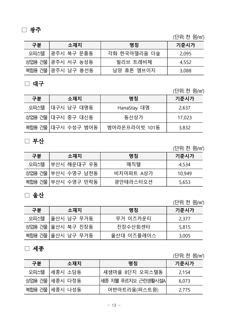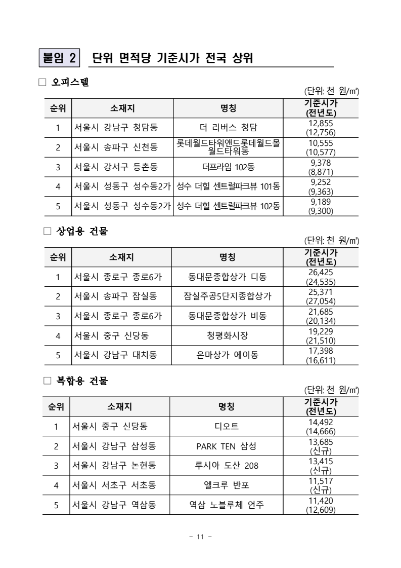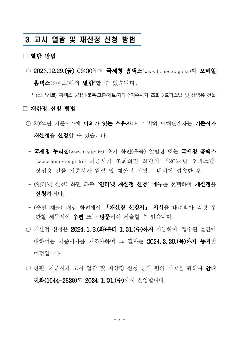 - 1 - 국세청 보도참고자료 보도 시점 2023.12.29.(금) 12:00 배포 2023.12.29.(금) 10:00 2024년 「오피스텔 및 상업용 건물 기준시가」 정기 고시- 오피스텔 고시 이래 첫 하락, 중소도시 하락률 높고 서울·부산은 낮은 하락폭 - □ 국세청(청장 김창기)은 상속세 및 증여세법 제61조와 소득세법 제99조에 따라 2024년 「오피스텔 및 상업용 건물 기준시가」를 정기 고시합니다. ○ 기준시가는 오피스텔과 상업용 건물의 상속·증여세 등을 과세할 때 시가를 알 수 없는 경우 사용하며, 재산세 · 종합부동산세와 같은 보유세및 건강보험료 등 사회보험료 부과에는 적용하지 않습니다. * 재산세·종부세 및 건강보험료 등은 행안부의 시가표준액 적용 □ 이번 고시 물량은 전년 대비 5.9% 증가한 229만 호(오피스텔 122만호・ 상가 107만호)이며, 금리상승 및 부동산경기 침체의 영향으로 오피스텔은전년 대비 평균 4.77%, 상업용 건물은 평균 0.96% 기준시가가 하락하였습니다. ○ 지역별로 살펴보면, 오피스텔은 충남 13.03%, 전북 8.3%, 대구 7.9%, 상가는 세종과 울산이 각각 3.27%, 3.19%로 하락률이 두드러집니다. ○ 반면, 서울과 부산은 상대적으로 하락폭이 낮았으며, 1㎡당 기준시가가가장 높은 오피스텔은 서울 강남구의 ‘더 리버스 청담’(12,855천원), 상가는종로구의 ‘동대문종합상가 디동’(26,425천 원)인 것으로 나타났습니다. □ 기준시가는 2023. 12. 29.(금)부터 열람*할 수 있으며, 기준시가에 이의가 있는 소유자나 그 밖의 이해관계자는 재산정을 신청할 수 있습니다. * 홈택스 〉 상담·불복·고충·제보·기타 〉 기준시가 조회 〉 오피스텔 및 상업용 건물○ 재산정 신청은 2024. 1. 2.(화)부터 1. 31.(수)까지 가능하며, 접수된 물건에 대하여는 재조사하여 그 결과를 2024. 2. 29.(목)까지 통지할 예정입니다. □ 한편, 호별로 구분 고시되지 않는 일반 비주거용 건물의 경우 「기준시가 계산방법」에 따라 평가하는데, 계산 시 적용되는 건물 신축가격기준액및 구조지수, 용도지수, 위치지수 등도 일부 조정하여 고시합니다. - 2 - 담당 부서 자산과세국 책임자 과 장 최성영 (044-204-3441) <총괄> 상속증여세과 담당자 사무관 이정순 (044-204-3457) <협조> 정보화관리관 책임자 과 장 황남욱 (044-204-2501) 홈택스1담당관 담당자 사무관 이성필 (044-204-2542) - 3 - 1 2024년 「오피스텔 및 상업용 건물 기준시가」정기 고시1. 고시개요 □ 국세청(청장 김창기)은 상속세 및 증여세법 제61조와 소득세법 제99조에 따라 매년 오피스텔 및 상업용 건물(이에 딸린 토지 포함)의 호별 기준시가를산정·고시하고 있습니다. ○ 이번 고시 대상은 <전국 오피스텔> 및 <수도권, 5대 광역시, 세종특별자치시에 소재하는 일정 규모(3,000㎡ 또는 100호) 이상의 구분 소유된 상업용 건물>이며, 2023. 9. 1. 기준으로 적정가격을 평가하였습니다. □ 「오피스텔·상업용 건물 기준시가」는 오피스텔 및 상업용 건물에 대한 상속·증여세 및 양도소득세 과세 시 활용하게 됩니다. ○ 상속·증여받은 오피스텔 및 상업용 건물은 상속개시일·증여일 현재의 ‘시가’로 평가하여 과세하는 것이 원칙이나, ‘시가’를 알 수 없는 경우에는‘시가’에 근접하게 평가할 목적으로 산정한 기준시가로 과세합니다. ○ 또한, 취득 당시의 실지거래가액을 알 수 없는 재산을 양도하는 경우, 양도가액에서 차감하는 취득가액 계산 시 기준시가를 활용하고 있습니다. * 환산취득가액 = 양도당시 실지거래가액 × 취득당시 기준시가양도당시 기준시가□ 참고로, 오피스텔·상업용 건물에 대한 취득세·재산세 및 종합부동산세와 건강보험료 등 사회보험료 부과시에는 행정안전부의 시가표준액이 적용되며, 국세청에서 고시하는 기준시가는 활용되지 않습니다. - 4 - 2 고시 현황 □ 이번 고시는 2024. 1. 1. 이후 상속·증여하거나 양도하는 분부터 적용되며, 고시되는 부동산의 가격조사 기준일은 2023. 9. 1.입니다. ○ 고시하는 금액은 각 호별 단위 면적(㎡)당 가액으로, 각 호별 기준시가는 단위 면적(㎡)당 고시가액에 해당 호의 면적(전용면적과 공유면적의 합)을 곱하여 산정한 금액으로 합니다. □ 고시 물량은 오피스텔 122만호, 상업용건물 107만호, 총 229만호로 전년대비 5.9% 증가하였습니다. < 연도별 기준시가 고시현황 > (단위: 동, 호) 시행 년도 계 오피스텔 상업용 건물 복합용 건물* 동수 호수 동수 호수 동수 호수 동수 호수 계 오피스텔 상업용건물2024 33,111 2,289,626 12,465 374,234 12,034 927,690 8,612 987,702 843,833 143,869 2023 31,764 2,162,068 12,018 353,492 11,583 874,227 8,163 934,349 800,915 133,434 2022 27,755 1,871,970 9,074 192,864 11,056 808,968 7,625 870,138 745,340 124,798 2021 24,132 1,565,934 10,658 205,570 8,575 630,989 4,899 729,375 631,145 98,230 2020 22,581 1,443,701 9,847 180,509 8,291 604,384 4,443 658,808 567,712 91,096 * 복합용 건물: 1동의 건축물 내 오피스텔과 상업용 건물이 모두 있는 건축물 □ 고시 가격은 부동산 경기침체 및 금리상승 기조가 이어지며, 전년도보다오피스텔은 평균 4.77%, 상업용 건물은 평균 0.96% 하락하였습니다. ○ 지역별로 살펴보면, 오피스텔은 충남이 13.03%로 가장 많이 하락하였으며, 전북이 8.3%, 대구가 7.9% 하락하였습니다. 상가는 세종과 울산이 각각 3.