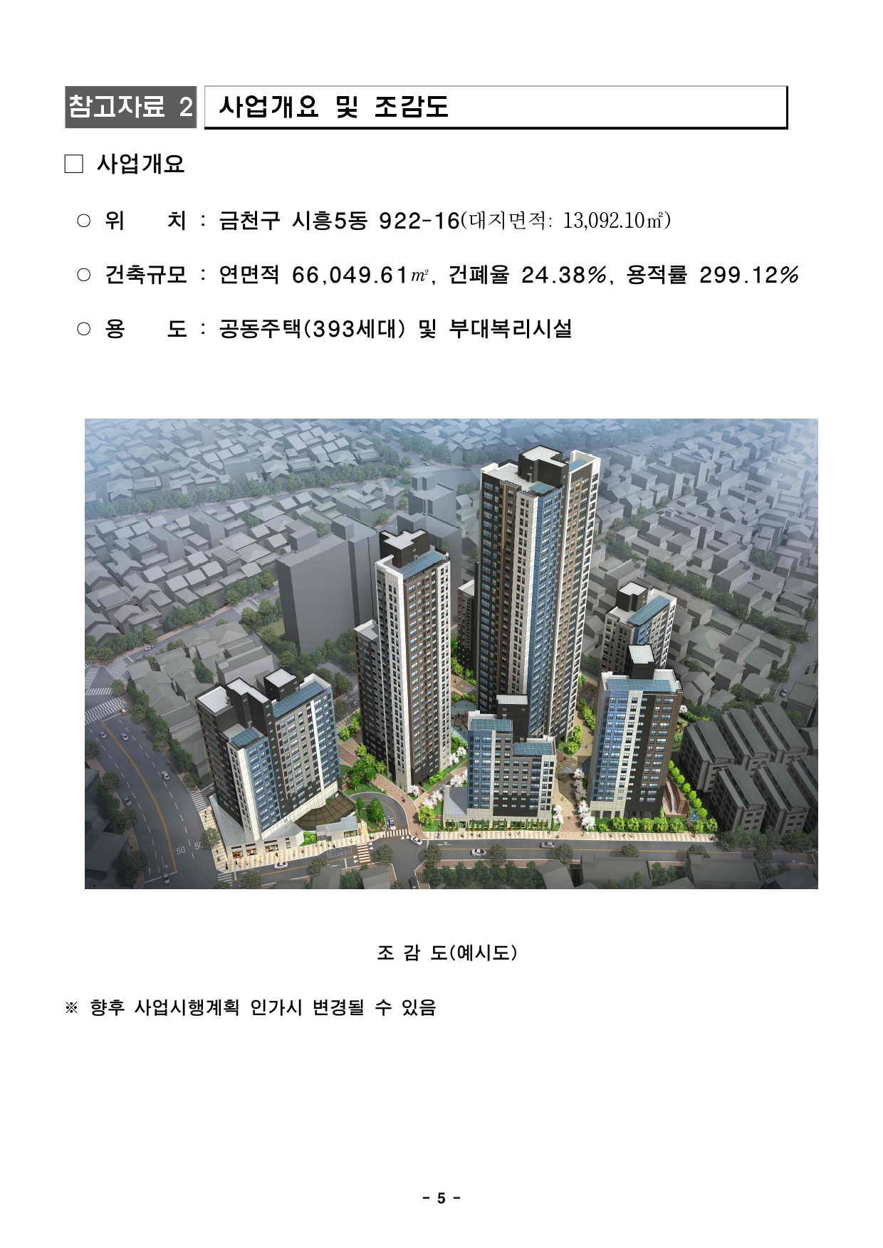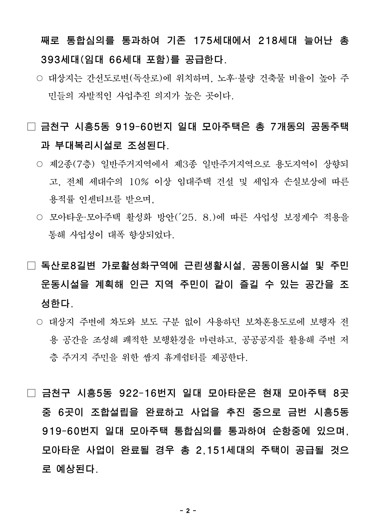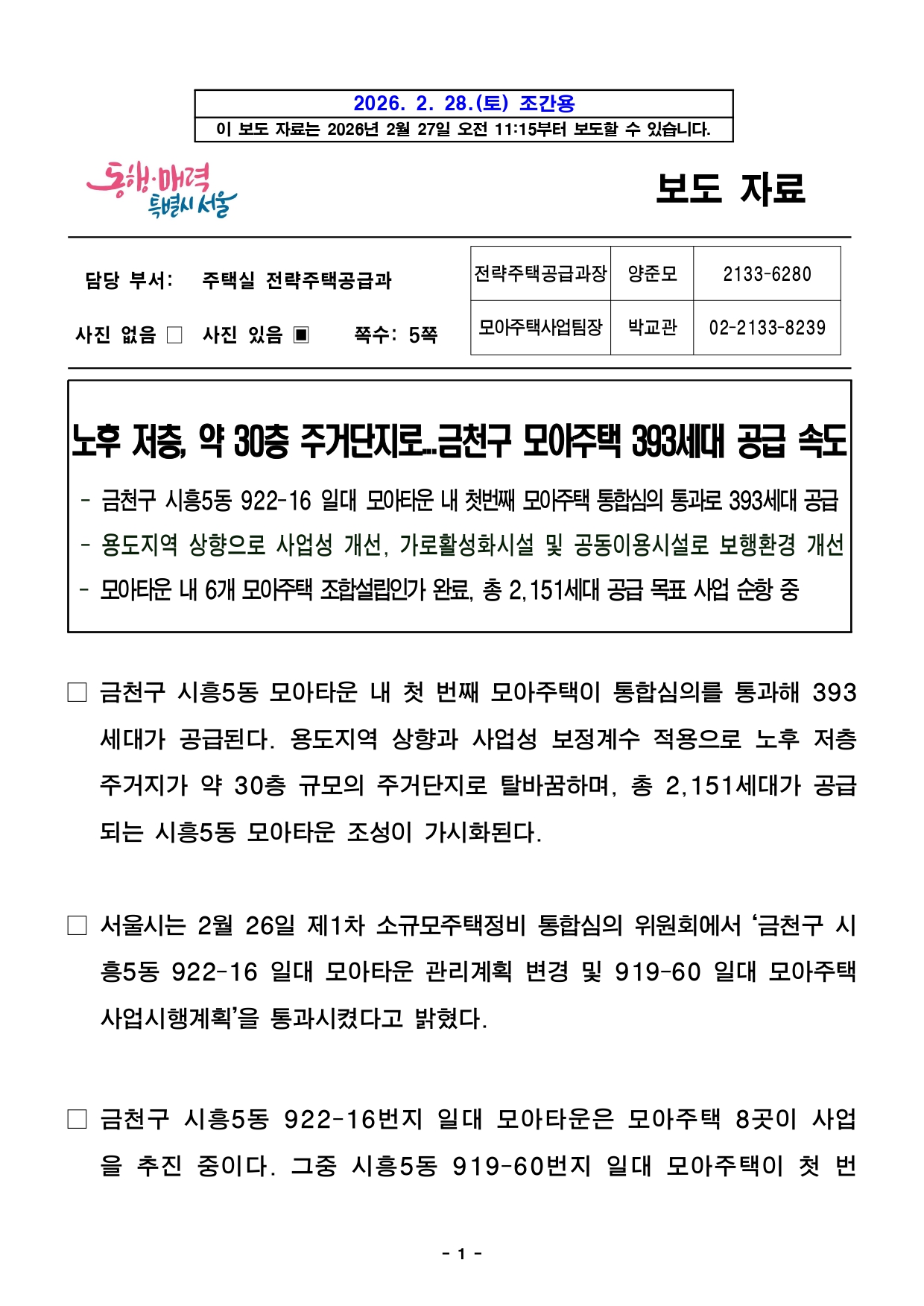 - 1 - 2026. 2. 28.(토) 조간용 이 보도 자료는 2026년 2월 27일 오전 11:15부터 보도할 수 있습니다. 보도 자료담당 부서: 주택실 전략주택공급과 전략주택공급과장 양준모 2133-6280 사진 없음 □ 사진 있음 ▣ 쪽수 모아주택사업팀장 박교관 02-2133-8239 : 5쪽 노후 저층, 약 30층 주거단지로...금천구 모아주택 393세대 공급 속도- 금천구 시흥5동 922-16 일대 모아타운 내 첫번째 모아주택 통합심의 통과로 393세대공급- 용도지역 상향으로 사업성 개선, 가로활성화시설 및 공동이용시설로 보행환경개선- 모아타운 내 6개 모아주택 조합설립인가 완료, 총 2,151세대 공급 목표 사업 순항중□ 금천구 시흥5동 모아타운 내 첫 번째 모아주택이 통합심의를 통과해393세대가 공급된다. 용도지역 상향과 사업성 보정계수 적용으로 노후저층주거지가 약 30층 규모의 주거단지로 탈바꿈하며, 총 2,151세대가공급되는 시흥5동 모아타운 조성이 가시화된다. □ 서울시는 2월 26일 제1차 소규모주택정비 통합심의 위원회에서 ‘금천구시흥5동 922-16 일대 모아타운 관리계획 변경 및 919-60 일대모아주택사업시행계획’을 통과시켰다고 밝혔다. □ 금천구 시흥5동 922-16번지 일대 모아타운은 모아주택 8곳이사업을 추진 중이다. 그중 시흥5동 919-60번지 일대 모아주택이첫번 - 2 - 째로 통합심의를 통과하여 기존 175세대에서 218세대 늘어난총393세대(임대 66세대 포함)를 공급한다. ○ 대상지는 간선도로변(독산로)에 위치하며, 노후·불량 건축물 비율이높아주민들의 자발적인 사업추진 의지가 높은 곳이다. □ 금천구 시흥5동 919-60번지 일대 모아주택은 총 7개동의 공동주택과 부대복리시설로 조성된다. ○ 제2종(7층) 일반주거지역에서 제3종 일반주거지역으로 용도지역이상향되고, 전체 세대수의 10% 이상 임대주택 건설 및 세입자 손실보상에따른용적률 인센티브를 받으며, ○ 모아타운·모아주택 활성화 방안('25. 8.)에 따른 사업성 보정계수적용을통해 사업성이 대폭 향상되었다. □ 독산로8길변 가로활성화구역에 근린생활시설, 공동이용시설및주민운동시설을 계획해 인근 지역 주민이 같이 즐길 수 있는 공간을조성한다. ○ 대상지 주변에 차도와 보도 구분 없이 사용하던 보차혼용도로에 보행자전용 공간을 조성해 쾌적한 보행환경을 마련하고, 공공공지를 활용해주변저층 주거지 주민을 위한 쌈지 휴게쉼터를 제공한다. □ 금천구 시흥5동 922-16번지 일대 모아타운은 현재 모아주택8곳중 6곳이 조합설립을 완료하고 사업을 추진 중으로 금번시흥5동919-60번지 일대 모아주택 통합심의를 통과하여 순항중에있으며,모아타운 사업이 완료될 경우 총 2,151세대의 주택이 공급될것으로 예상된다. - 3 - □ 최진석 서울시 주택실장은 “개발이 어려웠던 노후지역이 모아타운사업으로 신속한 주택 공급과 체계적인 환경 개선이 이뤄질 것”이라며“주변 지역개발 계획과도 연계될 수 있는 효율적인 계획으로질높은주거환경을 확산해 나가겠다”고 말했다. - 4 - 참고자료 1 위 치 도 위 치 도 - 5 - 참고자료 2 사업개요 및 조감도 □ 사업개요 ○ 위 치 : 금천구 시흥5동 922-16(대지면적: 13,092.10㎡) ○ 건축규모 : 연면적 66,049.61㎡, 건폐율 24.38%, 용적률 299.12%○ 용 도 : 공동주택(393세대) 및 부대복리시설 조 감 도(예시도) ※ 향후 사업시행계획 인가시 변경될 수 있음